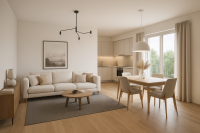 L'appartamento è composto da un luminoso soggiorno con angolo cottura, due camere da letto accoglienti e un bagno.